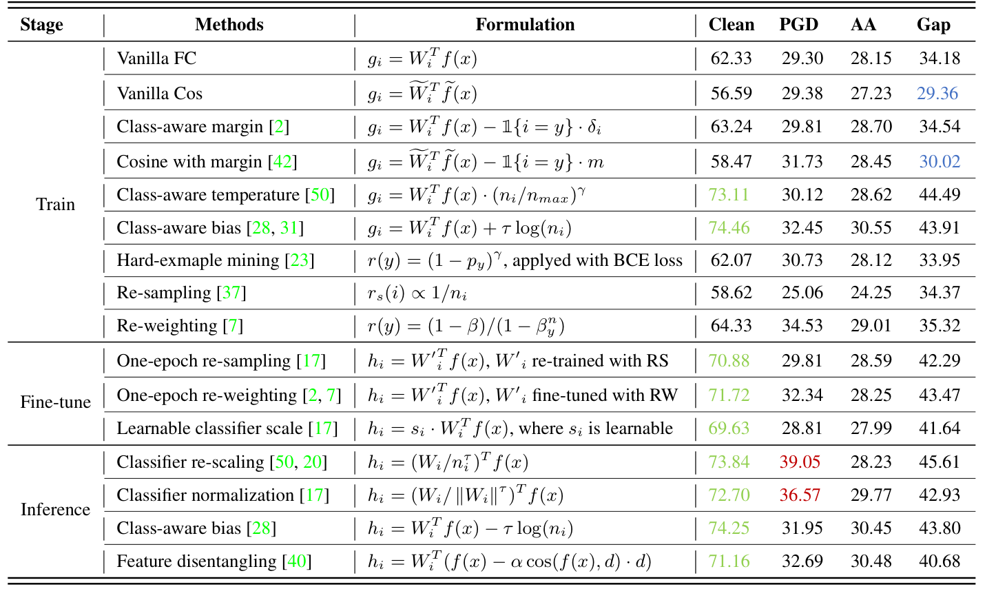 上式中的内部优化目标时找到最有效的对抗扰动, 外部目标是通过损失函数的梯度下降使模型对对抗样本也保持鲁棒性. 两个损失函数都可以用CE损失. 而对于LT分布下的模型优化方法, 可以大致分为三类: training, fine-tuning和inference. 同时对以下表达进行规定: $f(x)$为图像$x$输入模型后提取深层特征向量, $W$为分类器的权重向量; $\tilde{f}(x)$ 和 $\tilde{W}$ 则为对上述向量进行归一化后的结果.