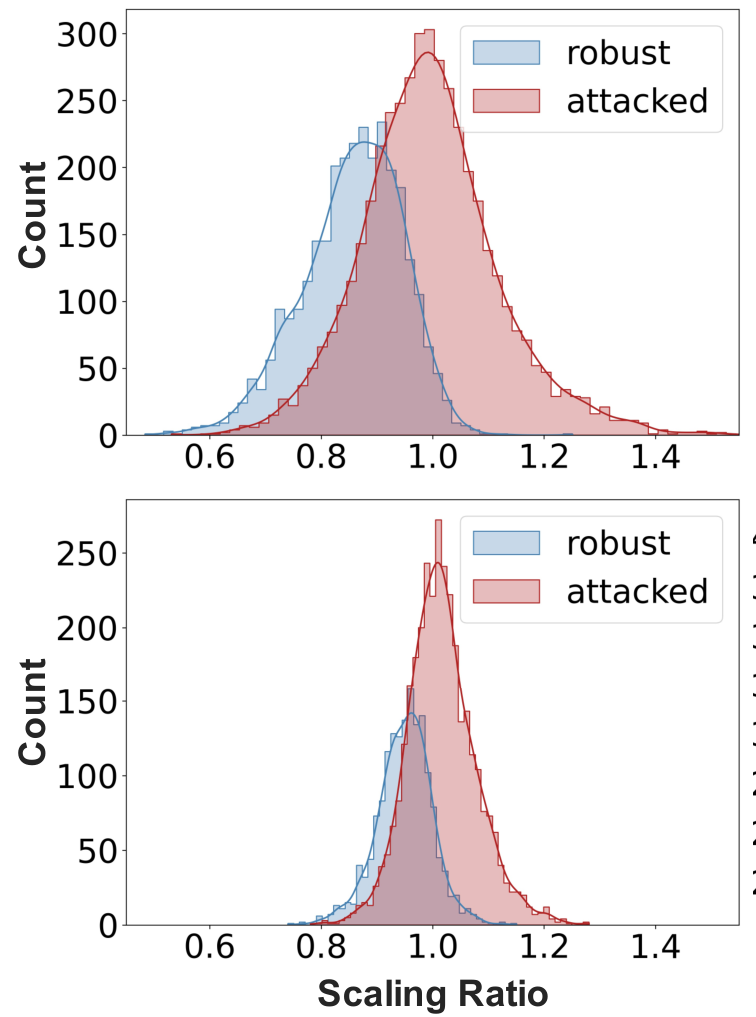 对于不同类别的scaling ratio分布如下图所示, 由上至下分别是原始样本和加入扰动后的对抗样本的scaling ratio和图像数目的分布情况: