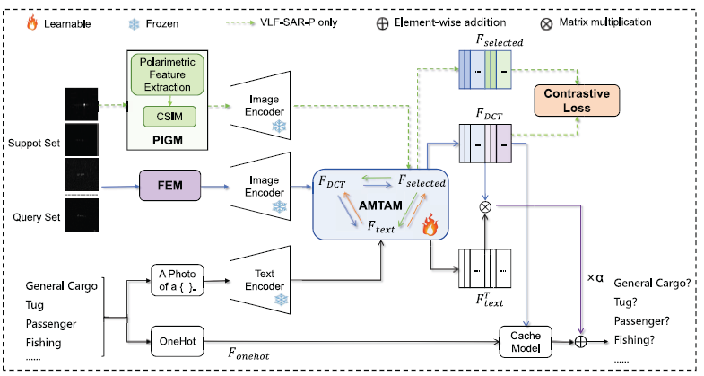 对于VLF-SAR-P, 论文提出了名为polarimetric feature selector(PFS)的模块, 在图像结构相似度的基础上用于提取最合适的测定偏振向量, 为了实现不同偏振方向的向量之间的动态选取, 作者进而提出了adaptive multimodal triple attention mechanism(AMTAM). 此外, 作者引入了对比学习的方法, 通过将上述feature 划分为positive和negative来增强对于feature的区分和选取.