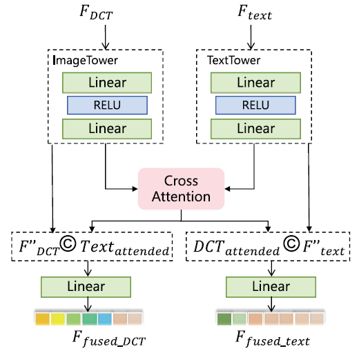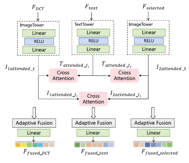 上图中起始的输入特征由冻结的CLIP模型的encoders提取获得, 经过简单的MLP和交叉注意力模块处理后获得互相关特征, 接着与原有的图像特征和文本特征进行拼接融合, 选择的方法是简单的拼接操作(concatenation), 对应的数学表达如下所示: