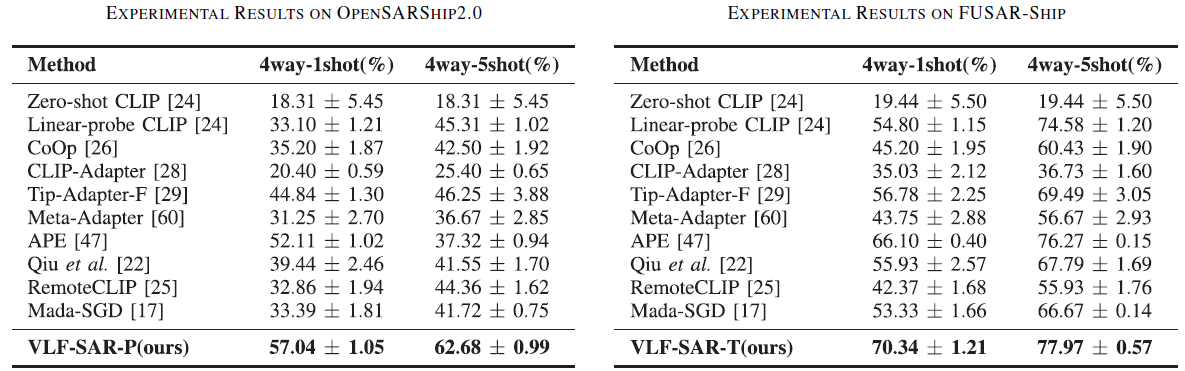 作者选用了多个数据集, 包括包含PolSAR图像的opensarship2.0数据集和普通SAR图像的FuSAR-ship数据集, 并进行了包括消融实验在内的多项完备实验对比, 此处仅展示核心实验结果. 对于PolSAR和SAR图像, 模型fewshot的结果如下图所示: